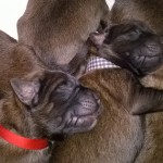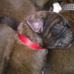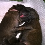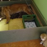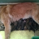 Štěňátkům jsou dnes 4 dny. Dobře baští a tak bedýnka, kde mají el. dečku kvůli teplu, jim začíná být těsná. Proto dnes dojde k přestavbě jejich domova – ohradí se jim větší prostor v porodní bedně a na dno se dá větší el. dečka. Ta jim zajišťuje tepelnou pohodu mezi krmením. Jelikož je 10 štěňátek a Doriska má „jen“ 7 struků, pomáhám jí od porodu s krmením miminek. Ve dne i v noci, každé dvě hodiny. Na správný čas mě upozorní Doris svým pískáním. Přendám k ní štěňátka z bedýnky, udělám sušené mléko do lahviček a krmím nepřisátá štěňátka. V průběhu krmení je střídám s těmi, co pijí od maminky, aby všechna štěňátka dostala každé krmení mateřské mléko. To je pro ně velice důležité. Doriska se průběžně stará i o vyprazdňování štěňátek. Perfektně pozná, která potřebují čůrat a kakat. Když mají plná bříška a začínají u Doris usínat, přendám je zpět na teplou podložku do bedýnky, kde se jen zavrní a spokojeně spí.
